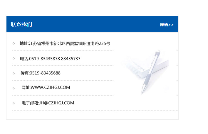 地址:常州市新北區(qū)友邦商務(wù)大廈1幢16、17層  電話:0519-85101652  傳真:0519-85112595  郵編:213022  網(wǎng)址:www.cz-jiayue_cn.wangyintianxia.com  郵箱:xiajifengaa@163.com